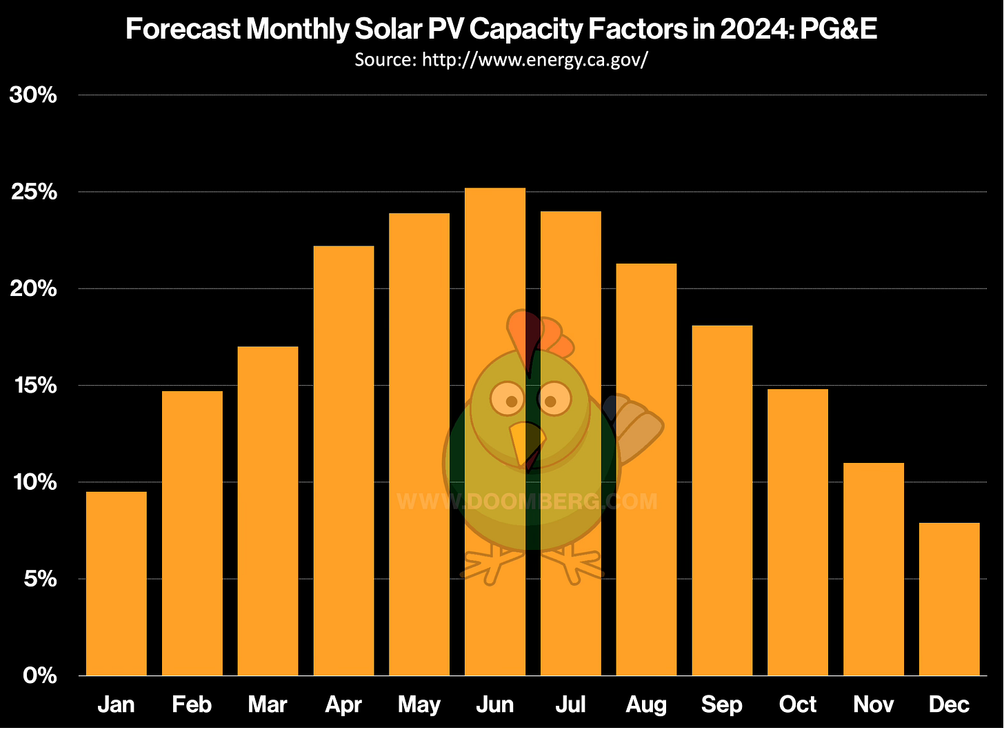 In December and January, California’s PV capacity factors dip below 10%, with extended stretches of minimal solar output. Given the state’s goal of completely purging hydrocarbons from the grid, what exactly is the plan for winter? Install 15-20 times more solar capacity than average daily demand? And how many batteries would be required to bridge a week or two of low production? How will they be recharged?