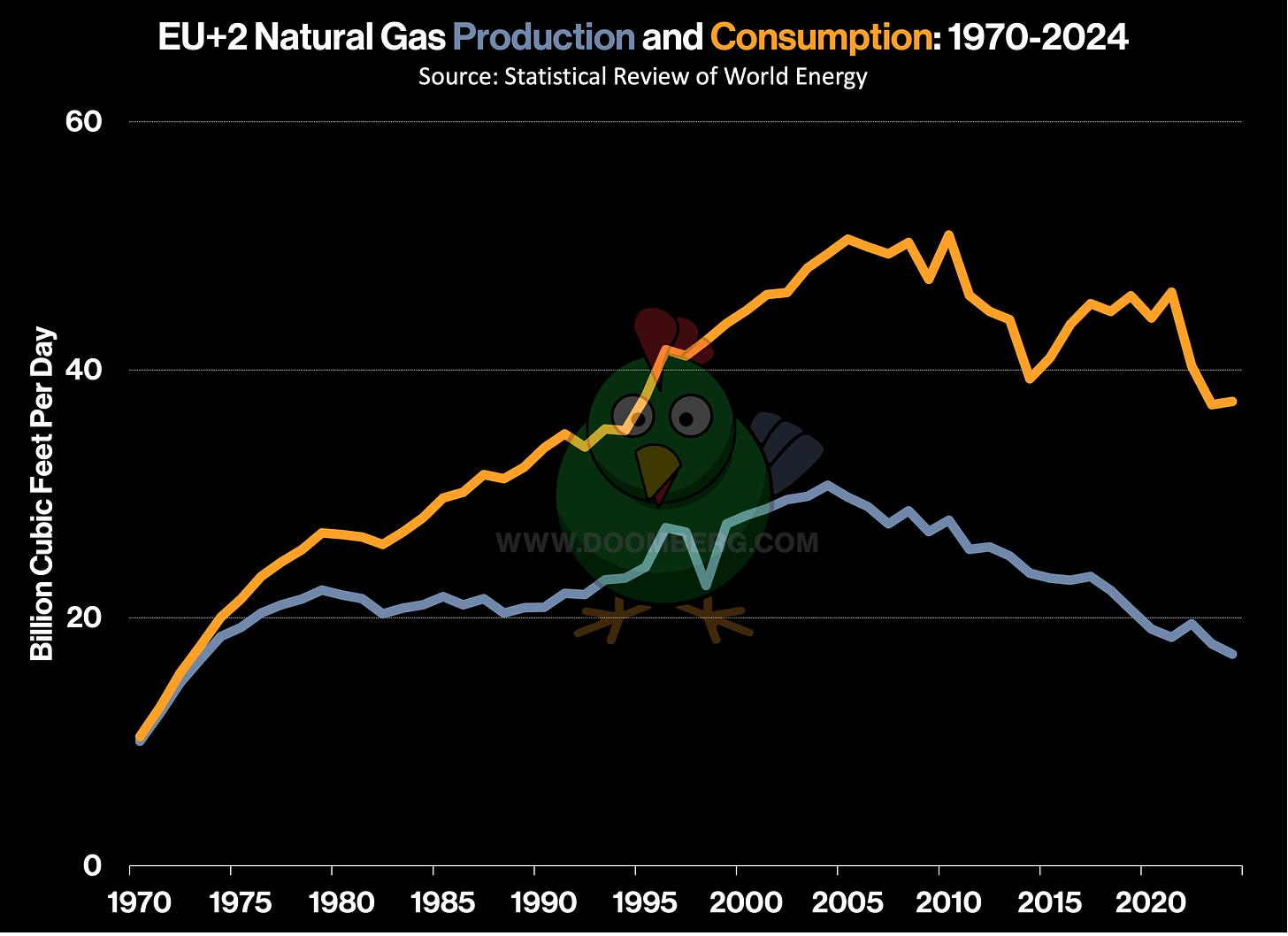 To quantify the scale of the challenge, it is best to combine the production and consumption statistics of the EU, Great Britain, and Norway (collectively, the EU+2). The latter two, the largest natural gas producers in Europe, are not members of the EU itself but are fully connected to it via pipeline. A quick perusal of the Statistical Review of World Energy indicates that the EU+2 produces less than half the gas it consumes, a gap of roughly 20 billion cubic feet per day (bcf/d). This is approximately equivalent to the entire natural gas output of the mighty Permian Basin.