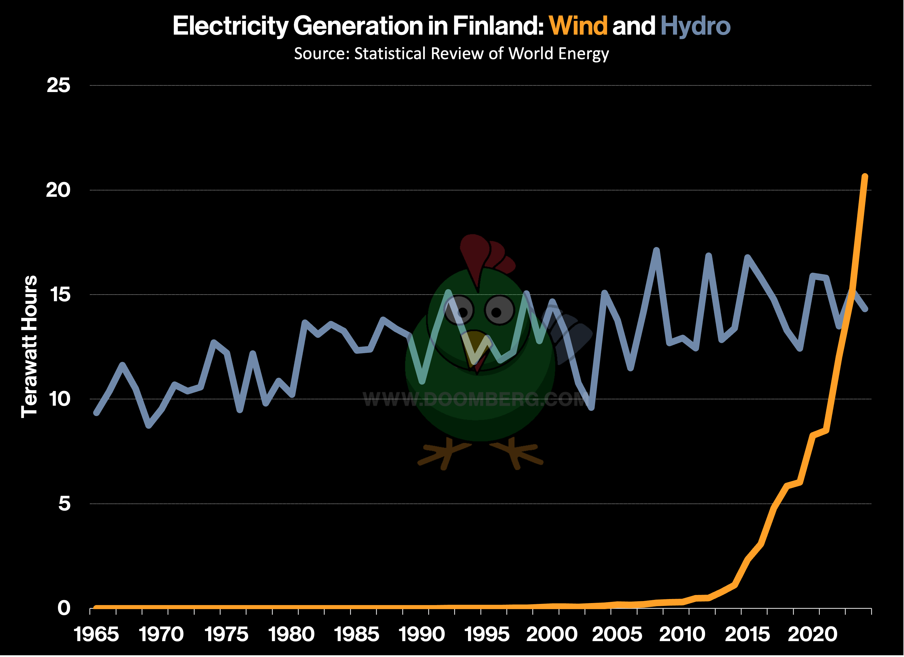 Even without looking, we guessed that intermittent sources of electricity in Finland must now exceed highly dispatchable ones—a predictable point of pain where stuff begins to break. Sure enough, a quick check of government data and the Statistical Review of World Energy reveals that the country sourced 39% of its power from nuclear reactors, 25% from wind, and 18% from hydroelectric facilities in 2024, and the rest from other sources and imports. Although nuclear is an excellent source of baseload power, it is not ideal for rapid load-following. With Finland systematically weaning itself off natural gas, its hydroelectric dams have been left to do the heavy lifting. See if you can spot the problem: